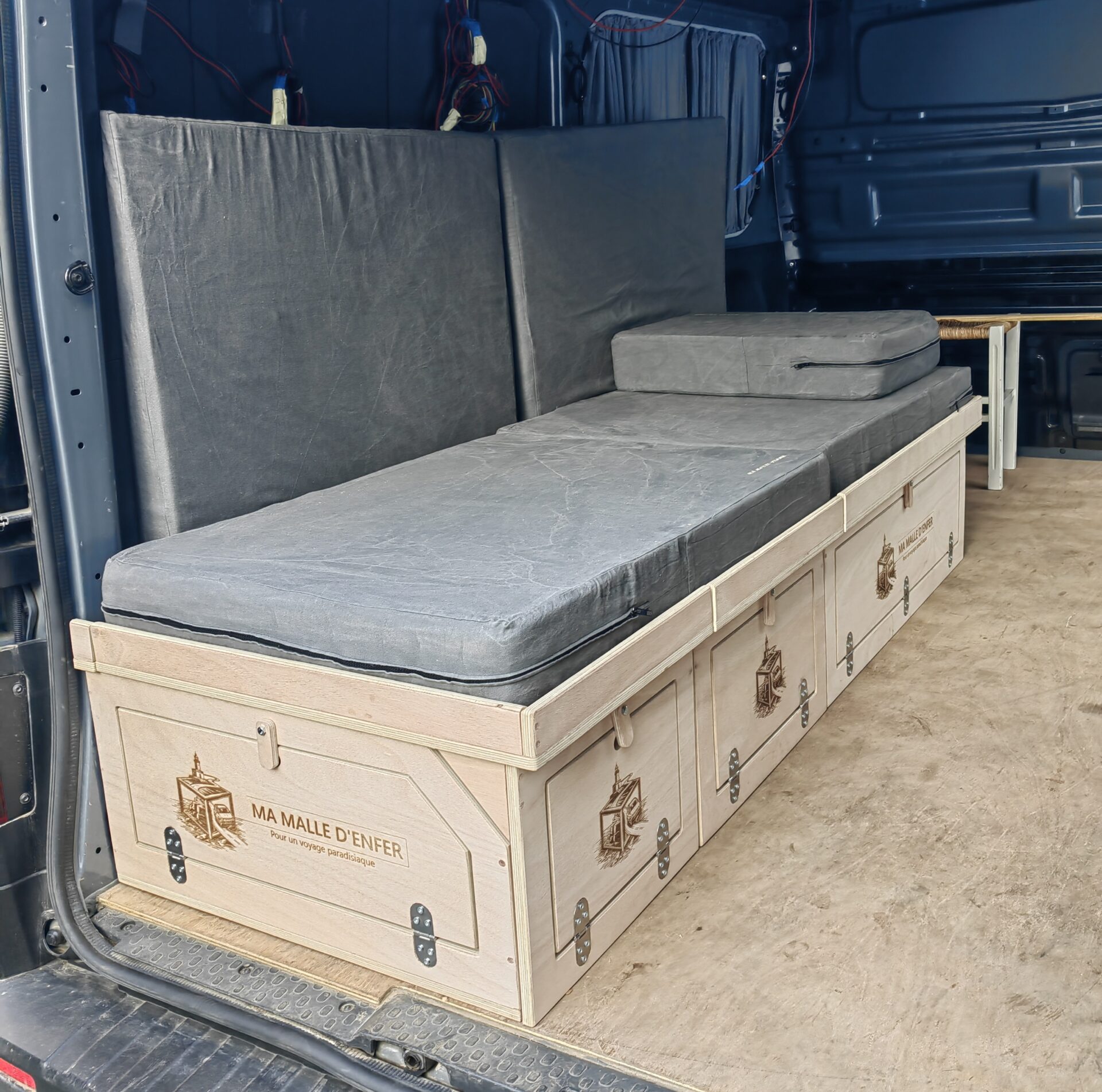 Le lit peigne Ma Malle d’Enfer est une solution d’aménagement 100 % amovible, conçue pour les utilitaires : fourgonnettes, fourgons et vans.